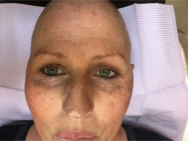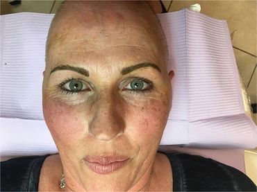 But eyebrows? Sometimes it looks and feels like there is no structure to your face when you start to lose them. Eyebrows “stop your face” They give definition and help give back some features. Above is a couple of clients that had them tattooed/ micro bladed and shaded just before they lost them all. Please keep in mind- when they are tattooed, they WILL lighten up a little (like a fresh hair color can after a couple washes) from how they look initially. You would need a touch up usually done around 8 weeks after the first session (this would obviously be worked around when your treatments are scheduled) Don’t let the word “tattoo” scare you. Microblading is no deeper than a paper cut. (numbing cream is used to keep you comfortable) This service is only preformed when your immune system is normal. So sometimes your initial/touch up appointment is done before you start treatment, or after a couple of treatments. If you are getting chemo every 3 weeks and its on a Friday- you would have the service done either Wednesday, Thursday, Friday or Saturday. That’s the window (as long as your oncologist is in agreement) If you can’t get your touch up until after treatments are over that’s ok too. At least the base and guide is there if you do lose your eyebrows. Then you’re not struggling trying to figure out where to draw them in.